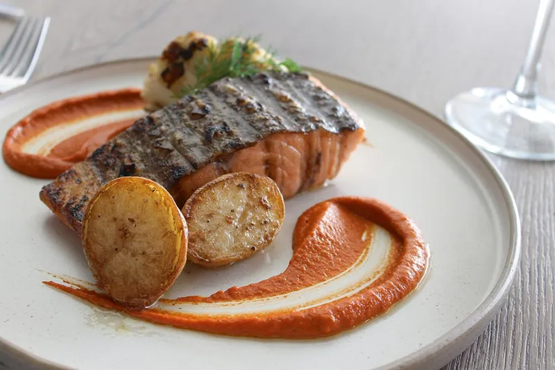 The restaurant’s rustic decor created the ambience of a sheltered wine cellar. We sampled the risotto, elegantly complemented by a red pepper coulis and a sprinkle of pumpkin seed crumb, as well as the roasted pork belly, artfully arranged on a bed of cumin pumpkin purée, tender greens, and a flavourful apple and carrot chutney with apricot accents, paired with the refreshing crispness of a Chardonnay MCC.