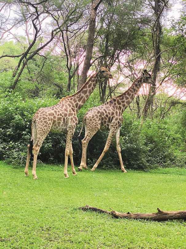 or veranda with comfortable outdoor seating facing rolling gardens, frequented by free-roaming giraffes, warthogs, zebras, various antelope species and cheeky monkeys.