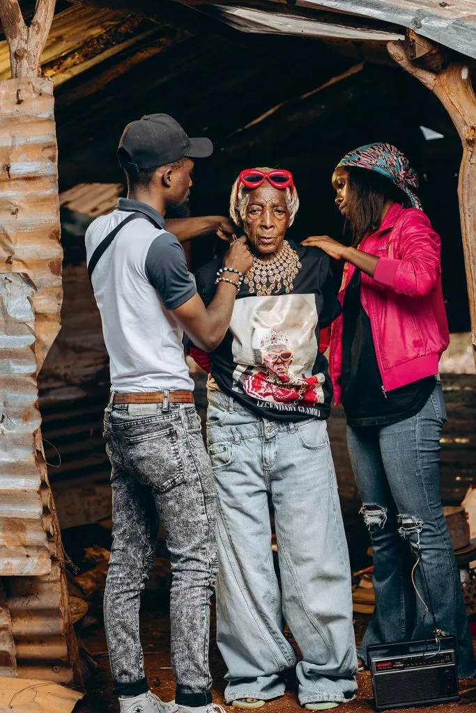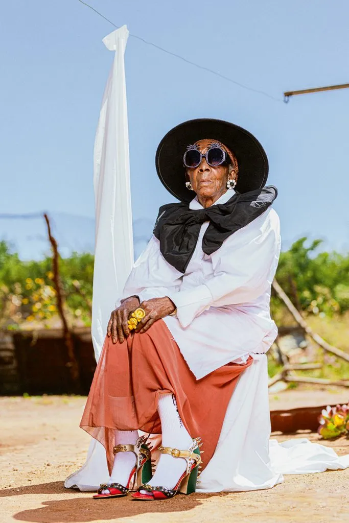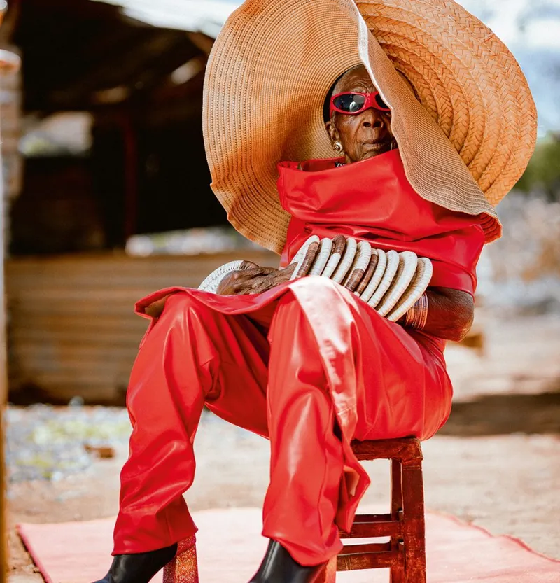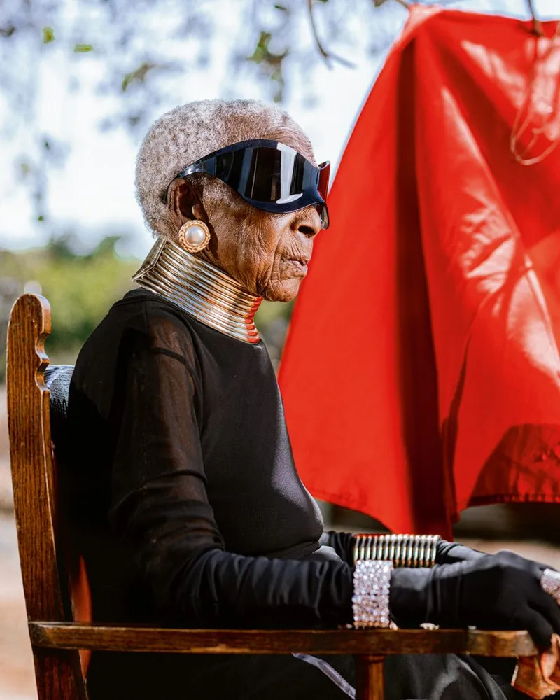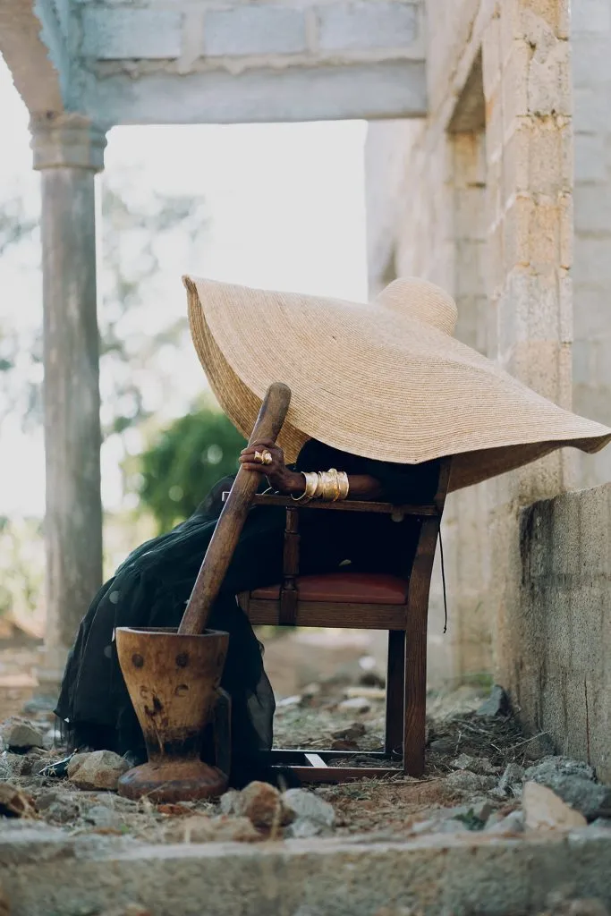 With her granddaughter by her side, they create a dialogue between high fashion and Zambian culture, integrating household objects like pipes, mbaula (brazier), and ibende (mortar and pestle) in their shoots. The rich contrast of couture against bleeding red soils, well-worn furniture, and concrete construction sites challenges notions of perceived beauty. With a playful spirit and a willingness to colour outside the lines, Margaret embodies a timeless elegance that her granddaughter honours with each ensemble. Together, they craft a narrative of resilience and beauty, reminding us all that self-love and creativity are ageless pursuits.