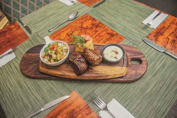 a vast array of local and international cuisine from sizzling grilled steak to mouth-watering burgers and chips and rich desserts. It is open from 6 am to